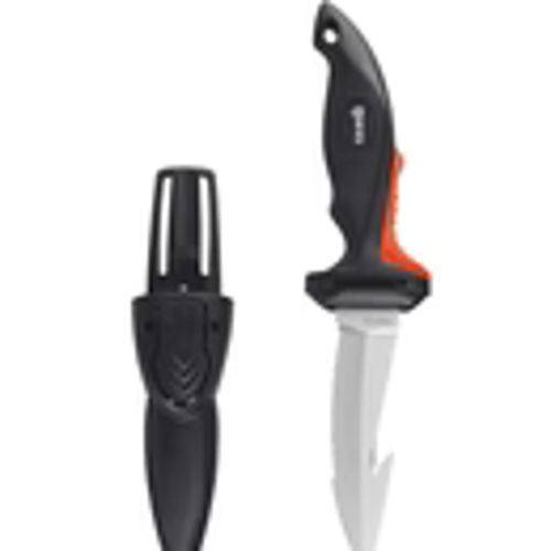 The Mares Force Plus knife is a small and easy to handle dive knife. It has a a soft ergonomic handle for good grip and an overall blade length of 10cm. The knife is easy to release from it's sheath, even with thick gloves on and is adaptable to Mares buoys, bcds and hoses. It comes with an attechment kit for Mares BCDs